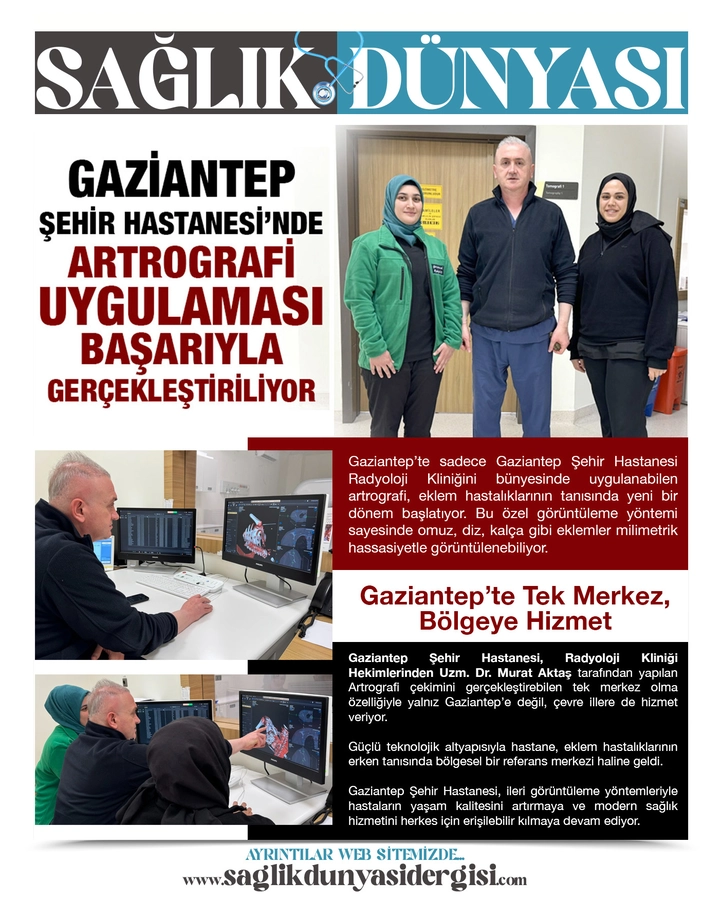 Gaziantep'te sadece Gaziantep Şehir Hastanesi Radyoloji Kliniğini bünyesinde uygulanabilen artrografi, eklem hastalıklarının tanısında yeni bir dönem başlatıyor. Bu özel görüntüleme yöntemi sayesinde omuz, diz, kalça gibi eklemler milimetrik hassasiyetle görüntülenebiliyor.