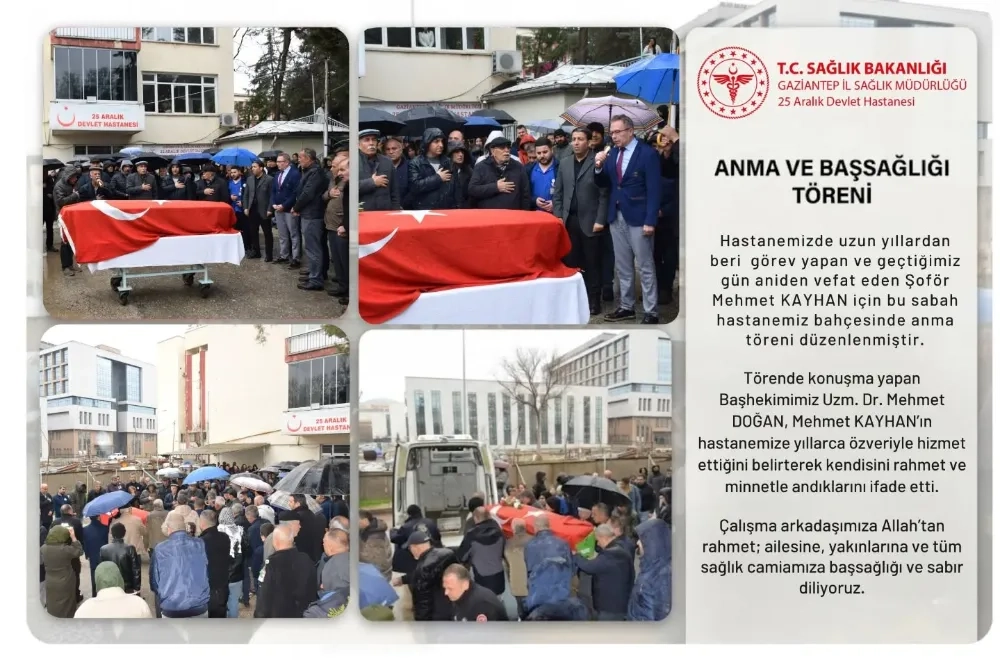 Hastane Başhekimi Uzm. Dr. Mehmet Doğan tarafından yayımlanan taziye mesajında, “Hastanemizde uzun yıllardan beri görev yapan şoför Mehmet Kayhan, bu sabah aniden rahatsızlanarak vefat etmiştir. Merhuma Allah’tan rahmet; kederli ailesine, yakınlarına ve tüm mesai arkadaşlarımıza başsağlığı dileriz.” ifadelerine yer verildi.
