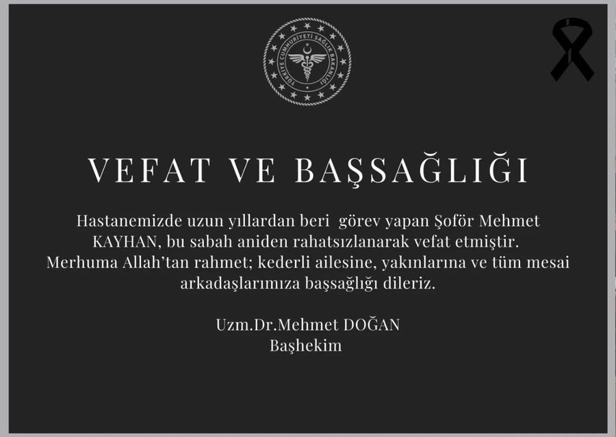 Hastane Başhekimi Uzm. Dr. Mehmet Doğan tarafından yayımlanan taziye mesajında, “Hastanemizde uzun yıllardan beri görev yapan şoför Mehmet Kayhan, bu sabah aniden rahatsızlanarak vefat etmiştir. Merhuma Allah’tan rahmet; kederli ailesine, yakınlarına ve tüm mesai arkadaşlarımıza başsağlığı dileriz.” ifadelerine yer verildi.