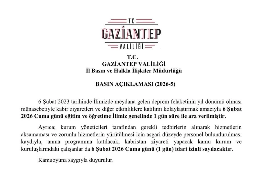 Gaziantep Valiliğinden yapılan açıklamada, 6 Şubat 2023 tarihinde kentte meydana gelen deprem felaketinin yıldönümü sebebiyle kabir ziyaretleri ve diğer etkinliklere katılımı kolaylaştırmak amacıyla 6 Şubat Cuma günü eğitim ve ögretime kent genelinde 1 gün süreyle ara verileceği belirtildi.