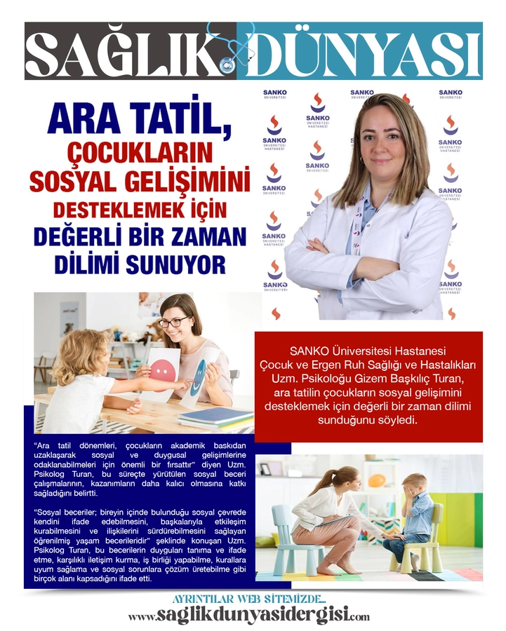 SANKO Üniversitesi Hastanesi Çocuk ve Ergen Ruh Sağlığı ve Hastalıkları Uzm. Psikoloğu Gizem Başkılıç Turan, ara tatilin çocukların sosyal gelişimini desteklemek için değerli bir zaman dilimi sunduğunu söyledi.