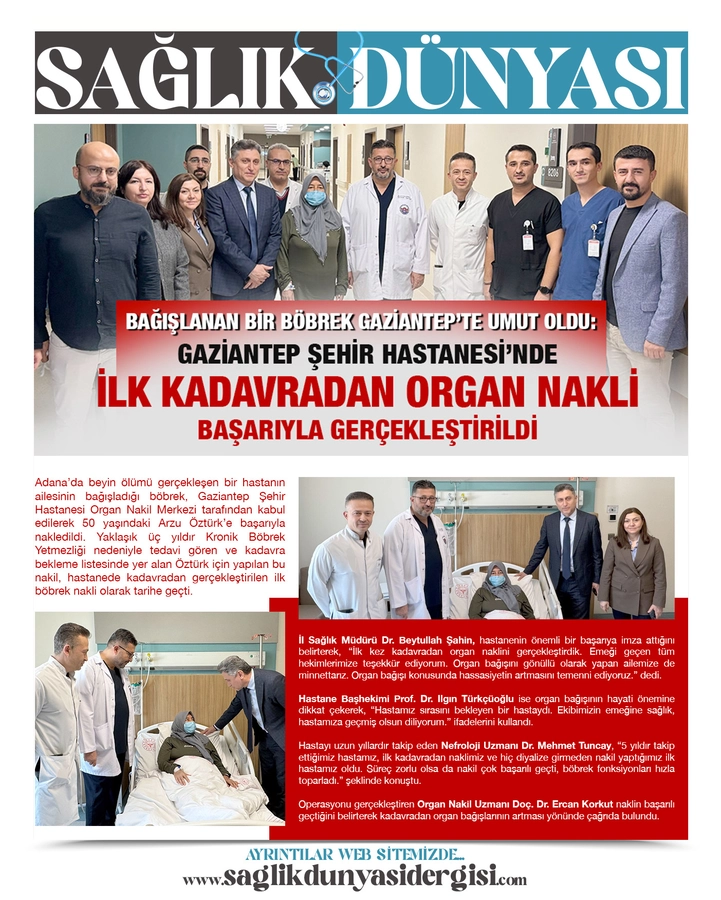 Gaziantep Şehir Hastanesi, bölgede sunduğu nitelikli hizmetlere bir yenisini daha ekleyerek kadavradan ilk organ naklini gerçekleştirdi; başarılarla dolu yolculuğunu kararlılıkla sürdürüyor.