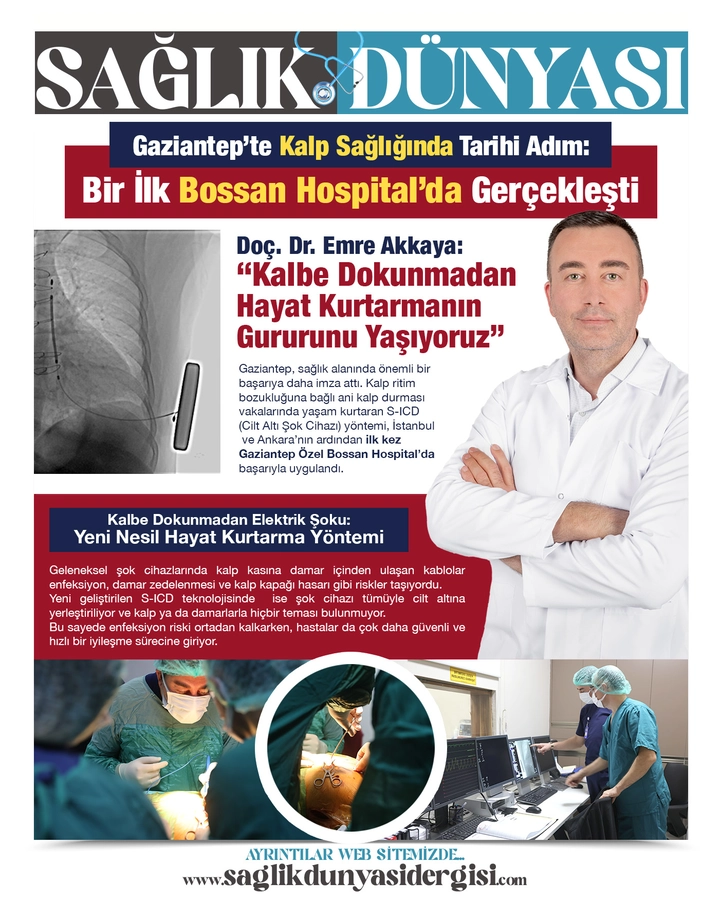 Gaziantep, sağlık alanında önemli bir başarıya daha imza attı. Kalp ritim bozukluğuna bağlı ani kalp durması vakalarında yaşam kurtaran S-ICD (Cilt Altı Şok Cihazı) yöntemi, İstanbul ve Ankara’nın ardından ilk kez Gaziantep Özel Bossan Hospital’da başarıyla uygulandı.