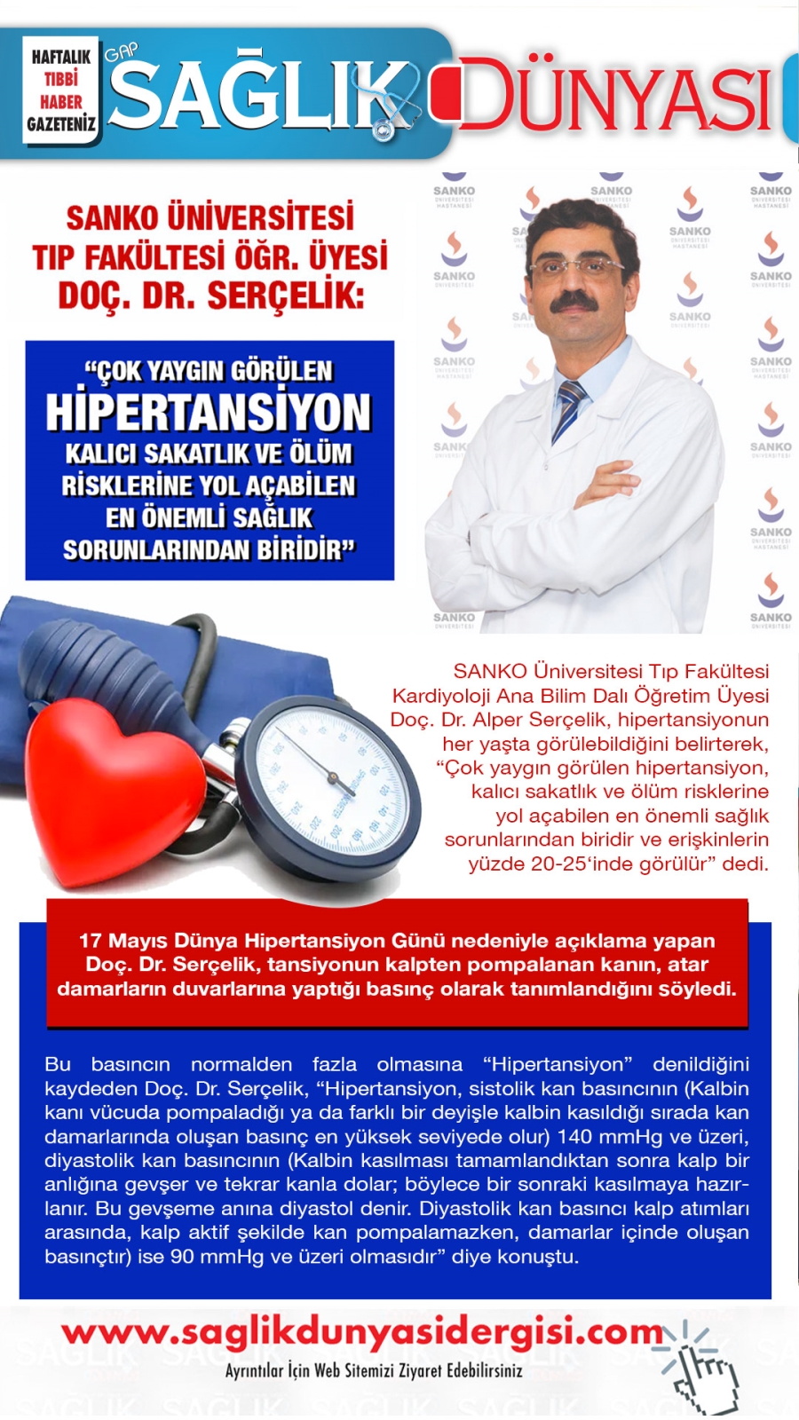 SANKO Üniversitesi Tıp Fakültesi Kardiyoloji Ana Bilim Dalı Öğretim Üyesi Doç. Dr. Alper Serçelik, hipertansiyonun her yaşta görülebildiğini belirterek, “Çok yaygın görülen hipertansiyon, kalıcı sakatlık ve ölüm risklerine yol açabilen en önemli sağlık sorunlarından biridir ve erişkinlerin yüzde 20-25‘inde görülür” dedi.