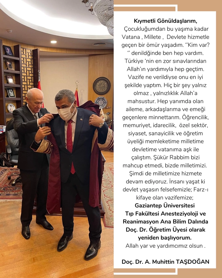 Sosyal medya hesabından duygusal bir açıklama yapan Doç. Dr. Taşdoğan, “Çocukluğumdan bu yaşa kadar Vatana, Millete, Devlete hizmetle geçen bir ömür yaşadım. ‘Kim var?’ denildiğinde ben hep vardım. Türkiye’nin en zor sanayilerinden Allah’ın yardımıyla hep geçtim. Vazife ne verildiyse onu en iyi şekilde yaptım. Hiç bir şey yalnız olmaz, yalnızlık Allah’a mahsustur. Hep yanımda olan âleme, arkadaşlarıma ve emeği geçenlere minnettarım. Öğrenncilik, memuriyet, idarecilik, özel sektör, siyaset, sanayicilik ve öğretim üyeliği memleketime, milletime, devletime, vatanıma aşkla hizmet ettim. Şükür Rabbim bizi mahcup etmedi, bizde milletimizi. Şimdi de milletimize hizmete devam ediyoruz. İnsanı yaşat ki devlet yaşasın felsefemiz; Farz-ı kifaye olan vazifemiz; Gaziantep Üniversitesi Tıp Fakültesi Anesteziyoloji ve Reanimasyon Anabilim Dalında Doç. Dr. Öğretim Üyesi olarak yeniden başlıyorum. Allah yar ve yardımcımız olsun” dedi.
