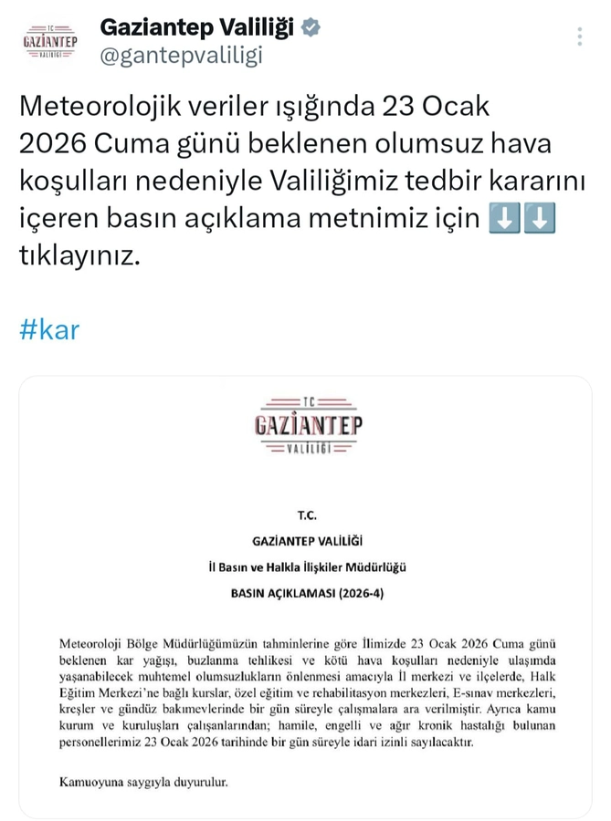 Gaziantep Valiliği , son meteorolojik veriler doğrultusunda kent genelinde kar yağışının etkisini artırmasının beklendiği, buna bağlı olarak buzlanma riskinin yükseldiği belirtildi. Açıklamada, tüm çalışmalara rağmen uçuş güvenliğinin sağlanması ve yolcu mağduriyetinin önlenmesi amacıyla havalimanının kapanma süresinin 23 Ocak 2026 Cuma günü saat 14.00’e kadar uzatıldığı duyuruldu.