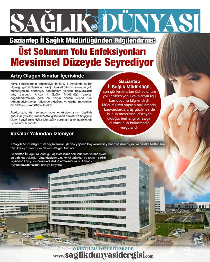 Gaziantep İl Sağlık Müdürlüğü, son günlerde artan üst solunum yolu enfeksiyonu vakalarıyla ilgili kamuoyunu bilgilendirdi. Müdürlükten yapılan açıklamada, başvurularda artış gözlense de bunun mevsimsel düzeyde olduğu, herhangi bir salgın durumunun bulunmadığı vurgulandı.