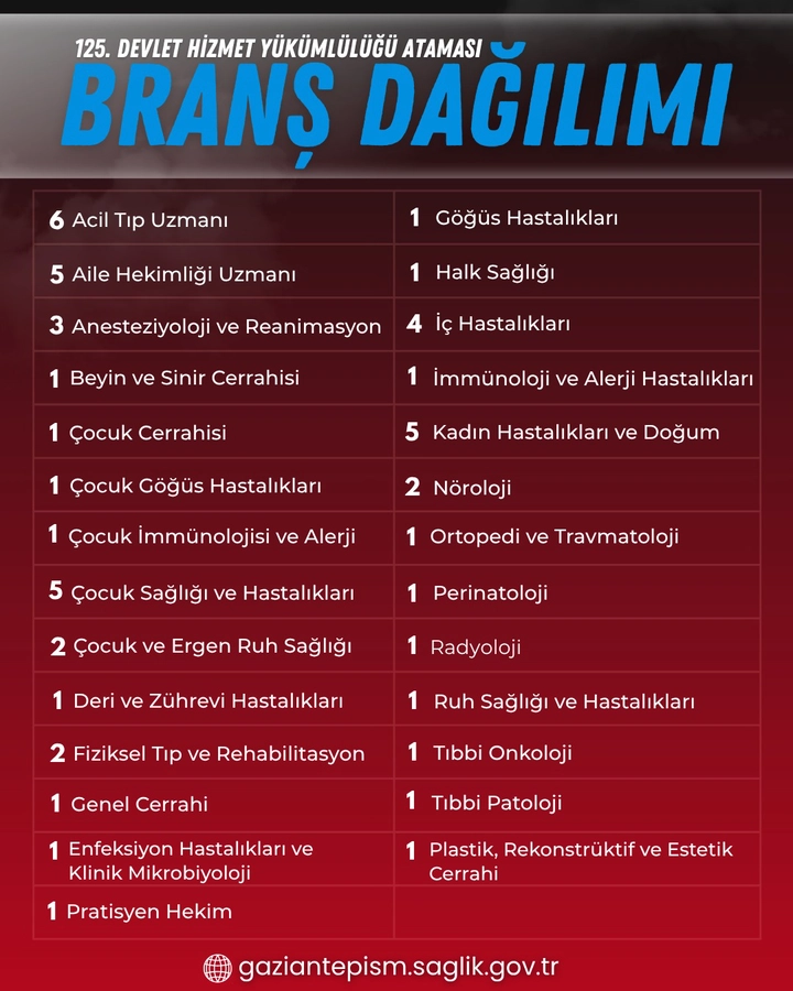 125.Dönem Devlet Hizmet Yükümlülüğü Atamaları kapsamında 6 Acil Tıp Uzmanı, 5 Aile Hekimi, 3 Anesteziyoloji ve Reanimasyon, 1 Beyin ve Sinir Cerrahisi, 1 Çocuk Cerrahisi, 1 Çocuk Göğüs Hastalıkları, 1 Çocuk İmmünolojisi ve Alerji, 5 Çocuk Sağlığı ve Hastalıkları, 2 Çocuk ve Ergen Ruh Sağlığı, 1 Deri ve Zührevi Hastalıkları, 2 Fiziksel Tıp ve Rehabilitasyon, 1 Genel Cerrahi, 1 Enfeksiyon Hastalıkları ve Klinik Mikrobiyoloji, 1 Pratisyen Hekim, 1 Göğüs Hastalıkları, 5 Kadın Hastalıkları ve Doğum, 1 İmmünoloji ve Alerji, 2 Nöroloji, 1 Ortopedi, 1 Perinatoloji, 1 Radyoloji, 1 Ruh Sağlığı ve Hastalıkları, 1 Tıbbi Onkoloji, 1 Tıbbi Patoloji, 1 Plastik ve Estetik Cerrahi uzmanı olmak üzere 52 hekim ataması gerçekleşti.