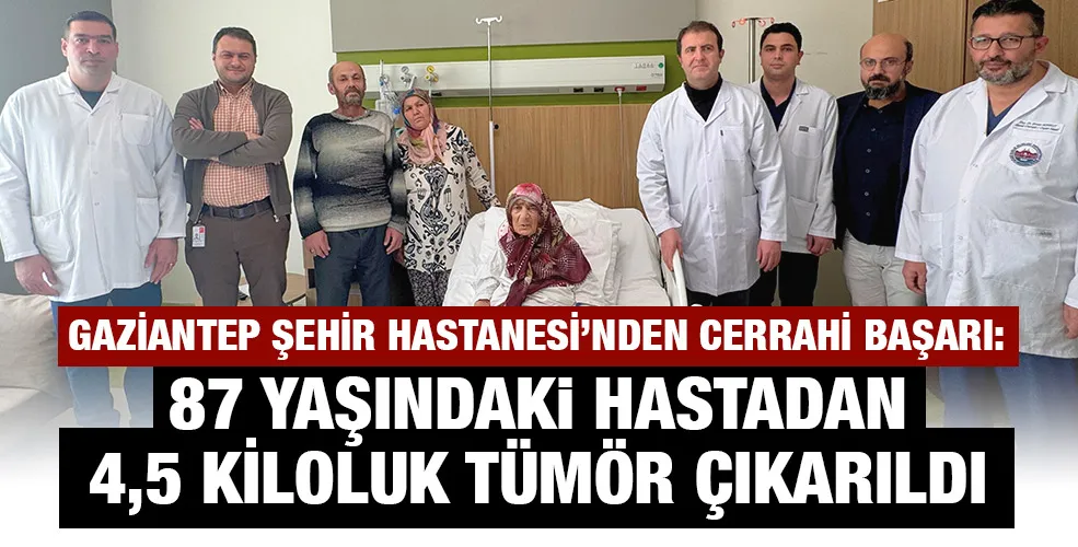 Gaziantep Şehir Hastanesi’nde ileri yaşına rağmen gerçekleştirilen başarılı bir ameliyat, hem hasta hem de sağlık camiası için umut oldu. Bulantı, kusma, kabızlık ve nefes darlığı şikâyetleriyle hastaneye başvuran 87 yaşındaki kadın hastanın yapılan tetkiklerinde, karın boşluğunda 4,5 kilogram ağırlığında ve 30×25×15 santimetre boyutlarında dev bir tümör tespit edildi.