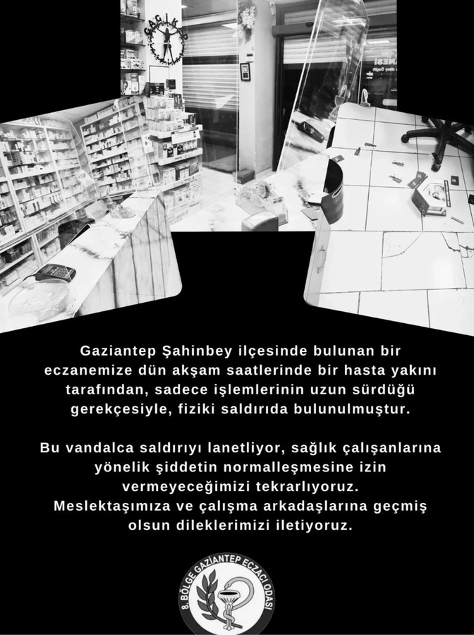 Gaziantep Şahinbey ilçesinde bulunan bir eczanemize dün akşam saatlerinde bir hasta yakını tarafından, sadece işlemlerinin uzun sürdüğü gerekçesiyle, fiziki saldırıda bulunulmuştur.