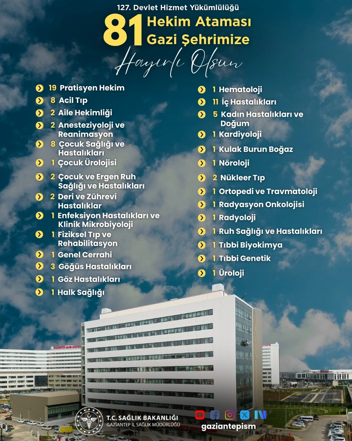 Sağlık Bakanlığı tarafından gerçekleştirilen son atama kapsamında, ilimize 81 hekim kadrosu tahsis edilmiştir. Şehrimizin sağlık hizmeti kapasitesini artıracak bu önemli atama ile birlikte vatandaşlarımıza daha hızlı ve daha etkin sağlık hizmeti sunmaya devam edeceğiz. Görevlerine başlayacak olan tüm hekimlerimize hoş geldiniz diyor; özverili ve başarılı bir çalışma hayatı diliyoruz. Gaziantep’imize ve sağlık camiamıza hayırlı olsun.