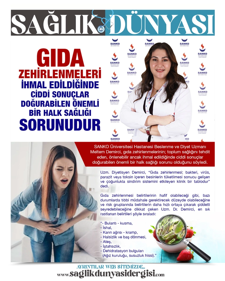 SANKO Üniversitesi Hastanesi Beslenme ve Diyet Uzmanı Meltem Demirci, gıda zehirlenmelerinin; toplum sağlığını tehdit eden, önlenebilir ancak ihmal edildiğinde ciddi sonuçlar doğurabilen önemli bir halk sağlığı sorunu olduğunu söyledi.