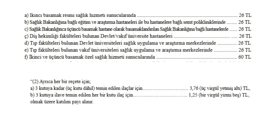 31 Aralık 2025 tarihinde Resmi Gazete yayımlanan Sosyal Güvenlik Kurumu Sağlık Uygulama Tebliğinde Değişiklik Yapılmasına Dair Tebliğ ile Hastane muayene ücretleri tekrar düzenlenerek, devlet hastanelerinde 26 TL, özel hastanelerde ise 60 TL oldu.