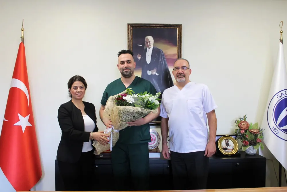 GAÜN Hastanesi Başhekimi Prof. Dr. Oğuzhan Saygılı ile Başhekim Yardımcısı Doç. Dr. Derya Aydın Şahin, Doç. Dr. Nevzat Gönder’i tebrik ederek çiçek takdim etti; akademik çalışmalarında başarılarının devamını diledi.