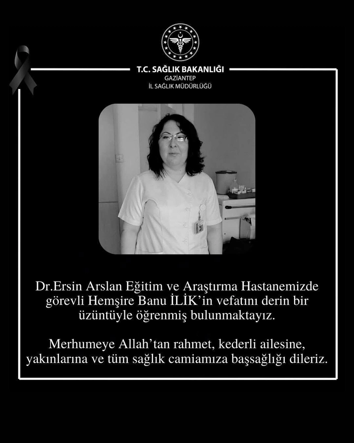 Dr. Ersin Arslan Eğitim ve Araştırma Hastanesi yönetimi tarafından yayımlanan taziye mesajında, “Çalışma arkadaşımız Hemşire Banu İlik’in vefatını derin bir üzüntüyle öğrenmiş bulunmaktayız. Merhumeye Allah’tan rahmet, kederli ailesine, yakınlarına ve tüm sağlık camiamıza başsağlığı dileriz.” ifadelerine yer verildi.