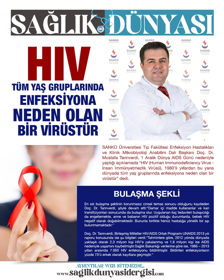 SANKO Üniversitesi Tıp Fakültesi Enfeksiyon Hastalıkları ve Klinik Mikrobiyoloji Anabilim Dalı Başkanı Doç. Dr. Mustafa Tanrıverdi, 1 Aralık Dünya AIDS Günü nedeniyle yaptığı açıklamada “HIV (Human Immunodeficiency Virus - İnsan İmmünyetmezlik Virüsü), 1980’li yıllardan bu yana dünyada tüm yaş gruplarında enfeksiyona neden olan bir virüstür” dedi.