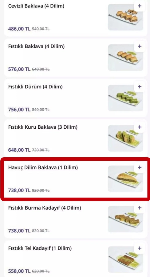 Türkiye’de internet üzerinden satış yapan bir tatlıcının fiyat listesi, görenleri isyan ettirdi. İşletmenin bir dilim baklavayı 738 liradan satışa sunması sosyal medyada tartışma konusu oldu.