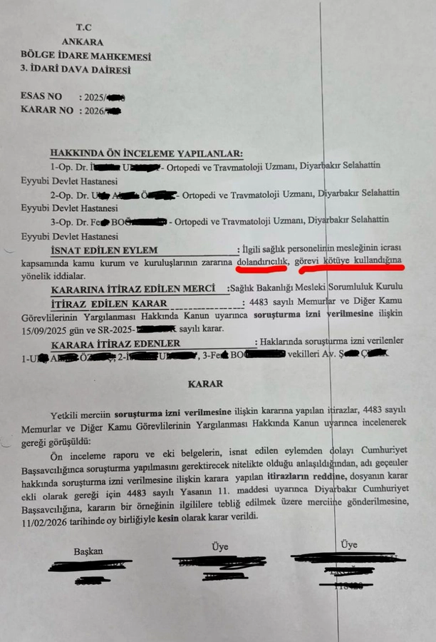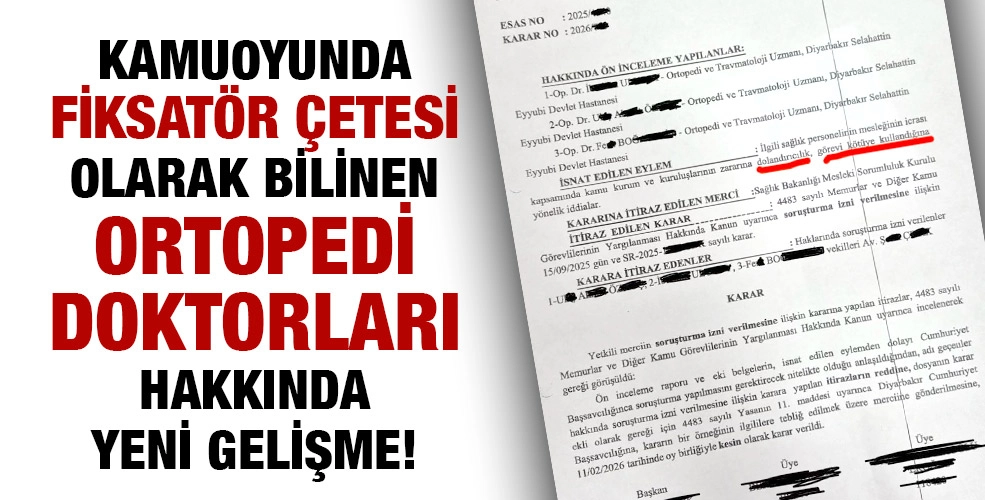 Daha önce Sağlık Bakanlığı müfettişlerinin yürüttüğü idari soruşturma sonucu memurluktan ihraç ve sürgün cezaları alan, Diyarbakır Selahaddin Eyyubi Devlet Hastanesi’nde görev yapan, Kamuoyunda Fiksatör Çetesi olarak anılan ortopedi doktorları hakkında şimdi de savcılığa “dolandırıcılık ve görevi kötüye kullanma” suçlarından adli soruşturma izni verildi.