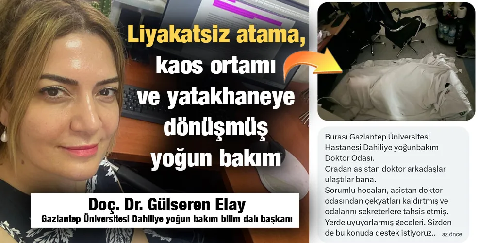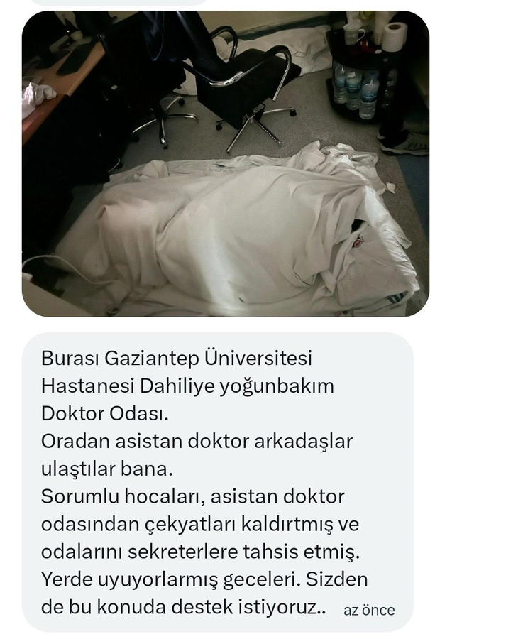 Ben altı yıldır bu yoğun bakımda çalışıyorum. Covid döneminde iki yıl boyunca gece gündüz çalıştık. Depremde bir buçuk ay boyunca gece gündüz yoğun bakımda bizzat kaldım. Nasıl çalıştığımı burada herkes bilir. Bu sorunların bir tanesi bile yaşanmadı. Bu kaostan beslenerek yoğun bakım doktor odasını yatakhaneye çevirmek üniversite ortamında kabul edilemez. Kimsenin çalışmadan falanca filancayı tanıyarak diploma almasına, hastaların ihmal edilmesine ve bu düzenin devam etmesine izin vermeyeceğim.