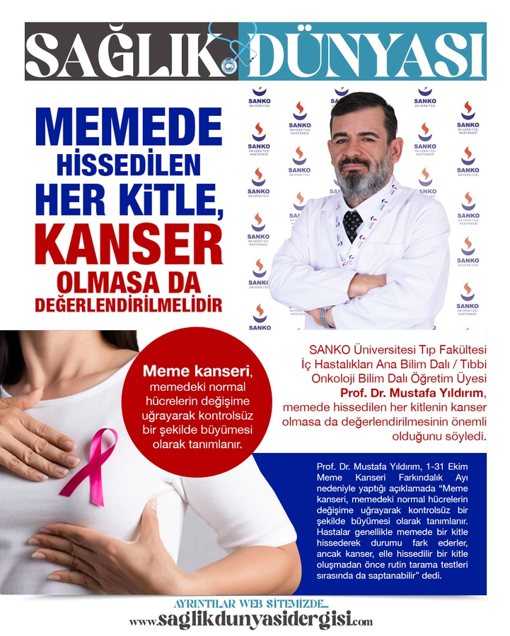 SANKO Üniversitesi Tıp Fakültesi İç Hastalıkları Ana Bilim Dalı / Tıbbi Onkoloji Bilim Dalı Öğretim Üyesi Prof. Dr. Mustafa Yıldırım, memede hissedilen her kitlenin kanser olmasa da değerlendirilmesinin önemli olduğunu söyledi.
