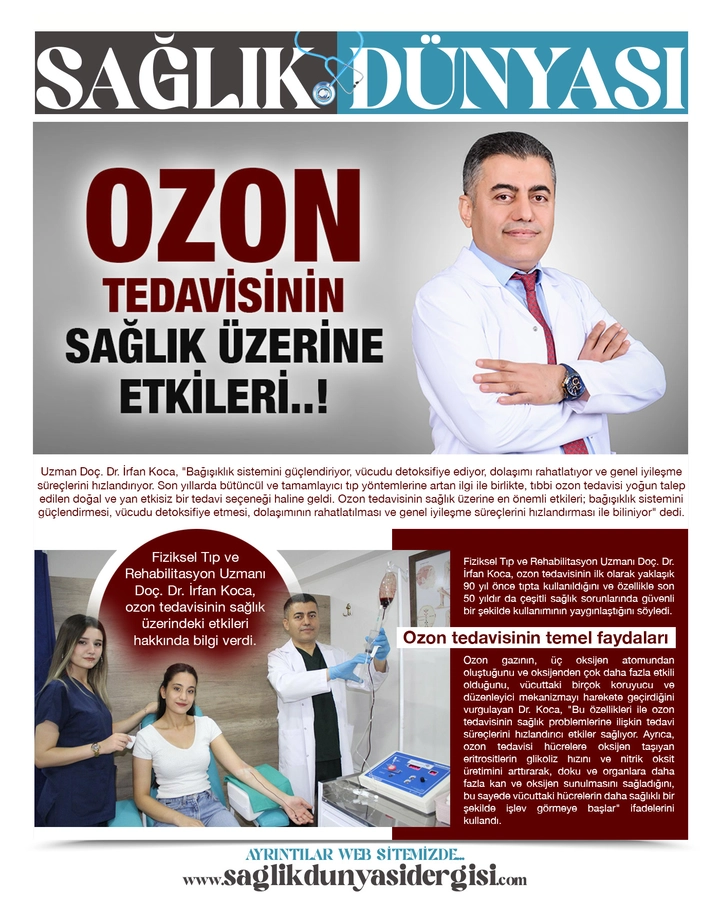 Uzman Doç. Dr. İrfan Koca, "Bağışıklık sistemini güçlendiriyor, vücudu detoksifiye ediyor, dolaşımı rahatlatıyor ve genel iyileşme süreçlerini hızlandırıyor. Son yıllarda bütüncül ve tamamlayıcı tıp yöntemlerine artan ilgi ile birlikte, tıbbi ozon tedavisi yoğun talep edilen doğal ve yan etkisiz bir tedavi seçeneği haline geldi. Ozon tedavisinin sağlık üzerine en önemli etkileri; bağışıklık sistemini güçlendirmesi, vücudu detoksifiye etmesi, dolaşımının rahatlatılması ve genel iyileşme süreçlerini hızlandırması ile biliniyor" dedi.