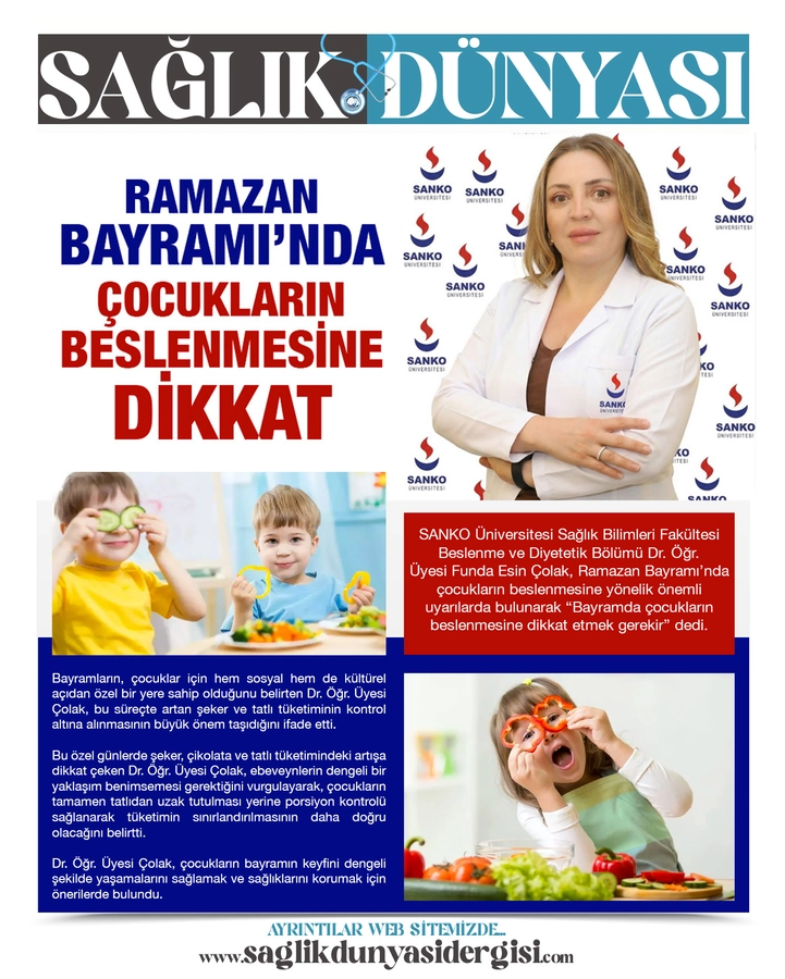 SANKO Üniversitesi Sağlık Bilimleri Fakültesi Beslenme ve Diyetetik Bölümü Dr. Öğr. Üyesi Funda Esin Çolak, Ramazan Bayramı’nda çocukların beslenmesine yönelik önemli uyarılarda bulunarak “Bayramda çocukların beslenmesine dikkat etmek gerekir” dedi.