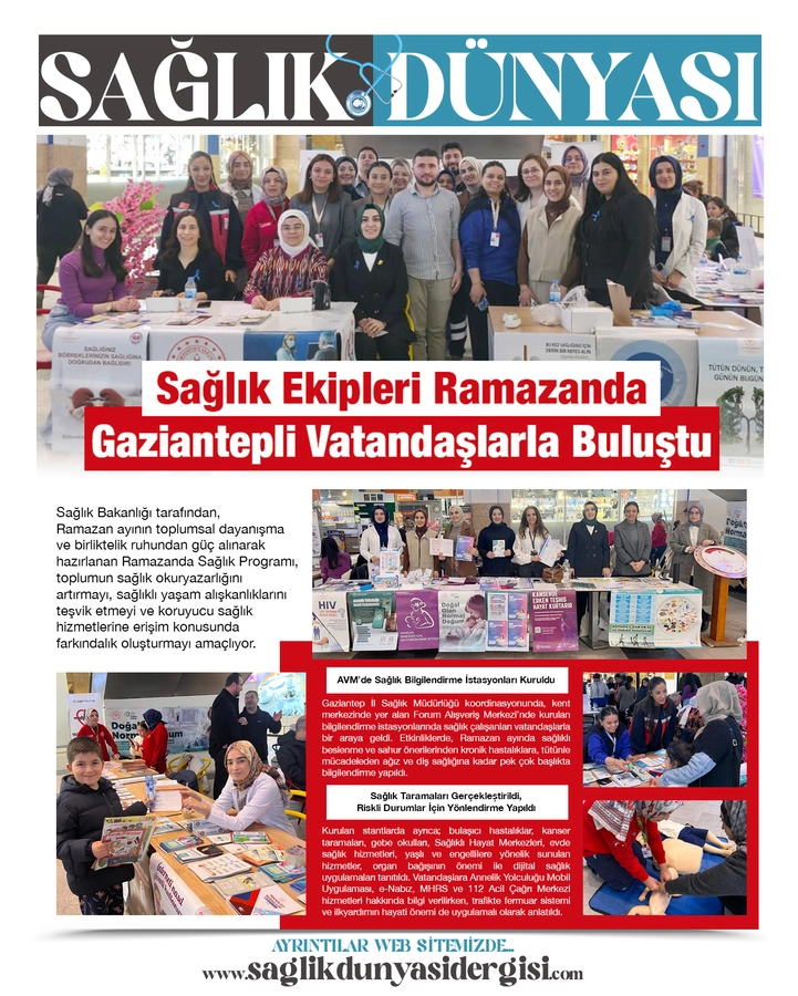 Gaziantep İl Sağlık Müdürlüğü koordinasyonunda, kent merkezinde yer alan Forum Alışveriş Merkezi’nde kurulan bilgilendirme istasyonlarında sağlık çalışanları vatandaşlarla bir araya geldi. Etkinliklerde, Ramazan ayında sağlıklı beslenme ve sahur önerilerinden kronik hastalıklara, tütünle mücadeleden ağız ve diş sağlığına kadar pek çok başlıkta bilgilendirme yapıldı.