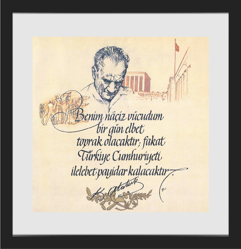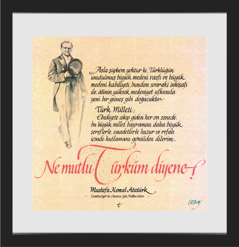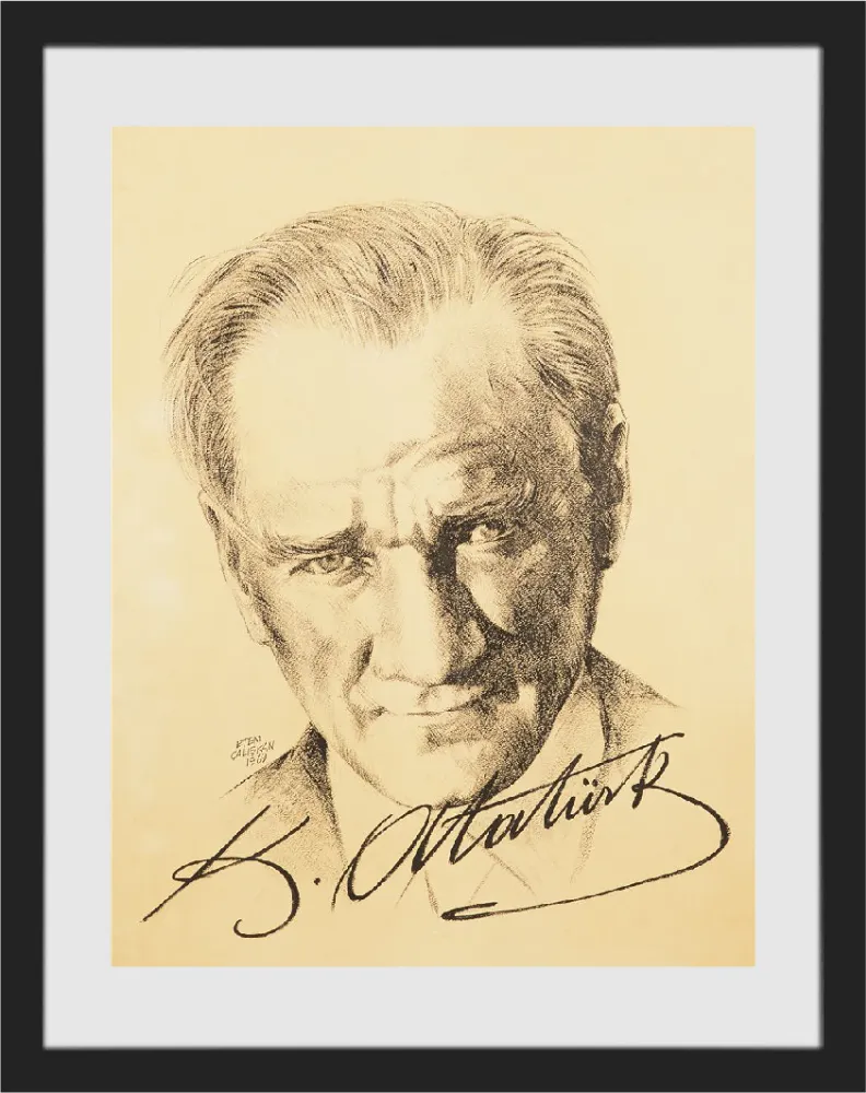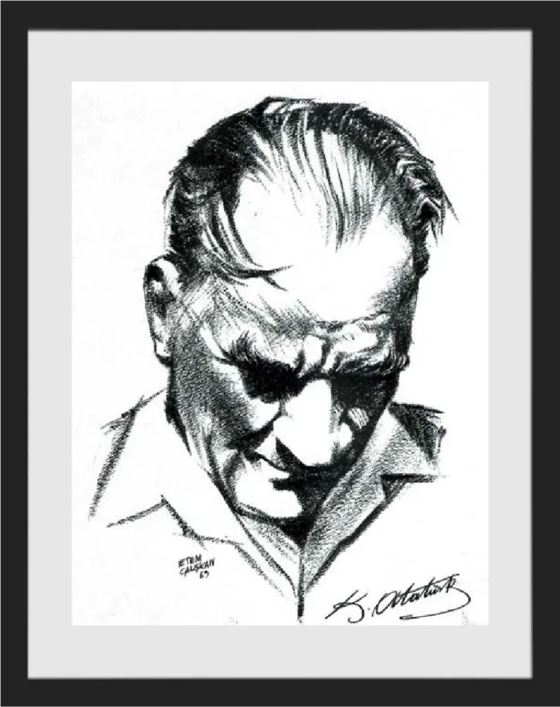 Yeni yazı ile hat yapan Etem Çalışkan, Türkiye'de ders kitaplarında yer alan Atatürk'ün Gençliğe Hitabesi ve İstiklal Marşı'nın yazımını yapan kişidir; fonda yer alan meşhur Atatürk portresinin de çizeridir.