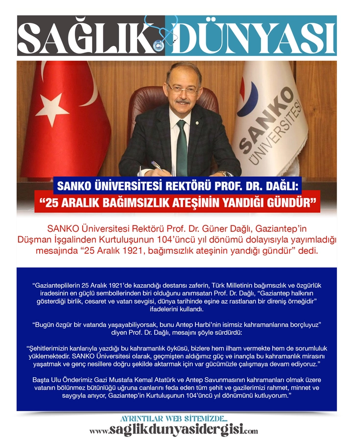 SANKO Üniversitesi Rektörü Prof. Dr. Güner Dağlı, Gaziantep’in Düşman İşgalinden Kurtuluşunun 104’üncü yıl dönümü dolayısıyla yayımladığı mesajında “25 Aralık 1921, bağımsızlık ateşinin yandığı gündür” dedi.
