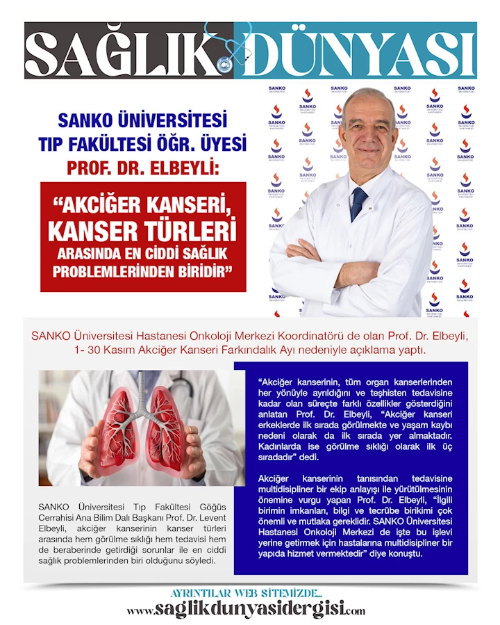 SANKO Üniversitesi Tıp Fakültesi Göğüs Cerrahisi Ana Bilim Dalı Başkanı Prof. Dr. Levent Elbeyli, akciğer kanserinin kanser türleri arasında hem görülme sıklığı hem tedavisi hem de beraberinde getirdiği sorunlar ile en ciddi sağlık problemlerinden biri olduğunu söyledi.