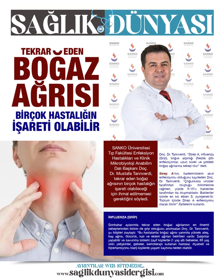 SANKO Üniversitesi Tıp Fakültesi Enfeksiyon Hastalıkları ve Klinik Mikrobiyoloji Anabilim Dalı Başkanı Doç. Dr. Mustafa Tanrıverdi, tekrar eden boğaz ağrısının birçok hastalığın işareti olabileceği için ihmal edilmemesi gerektiğini söyledi.