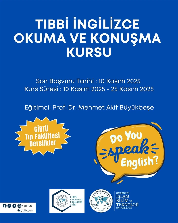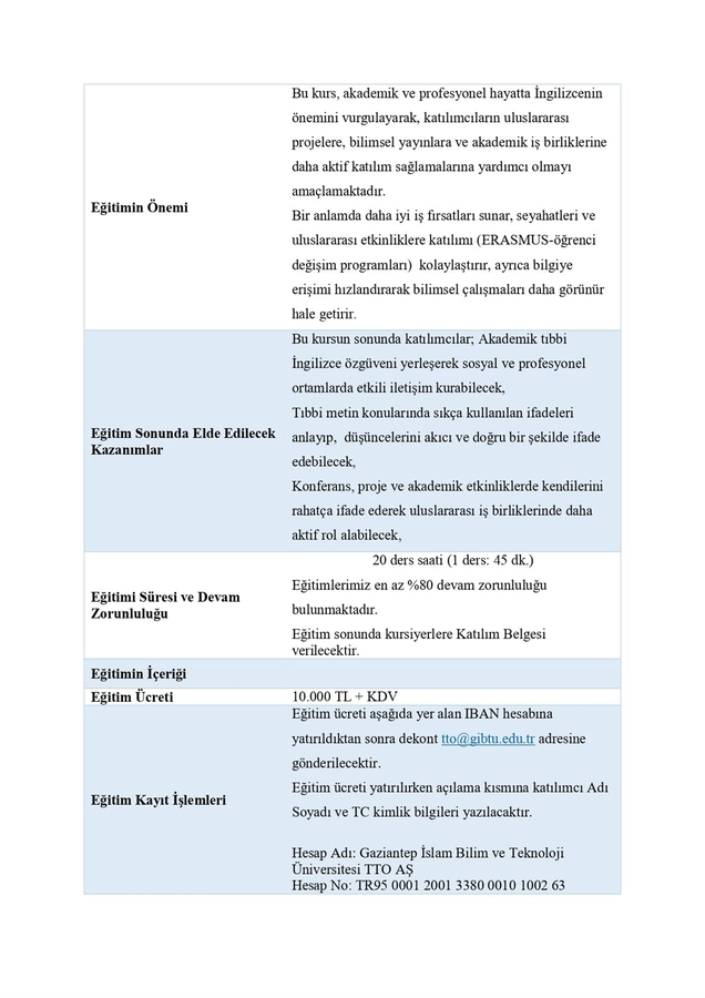 | Eğitim Sonunda Elde Edilecek Kazanımlar | Bu kursun sonunda katılımcılar; Akademik tıbbi İngilizce özgüveni yerleşerek sosyal ve profesyonel ortamlarda etkili iletişim kurabilecek, Tıbbi metin konularında sıkça kullanılan ifadeleri anlayıp, düşüncelerini akıcı ve doğru bir şekilde ifade edebilecek, Konferans, proje ve akademik etkinliklerde kendilerini rahatça ifade ederek uluslararası iş birliklerinde daha aktif rol alabilecek, |