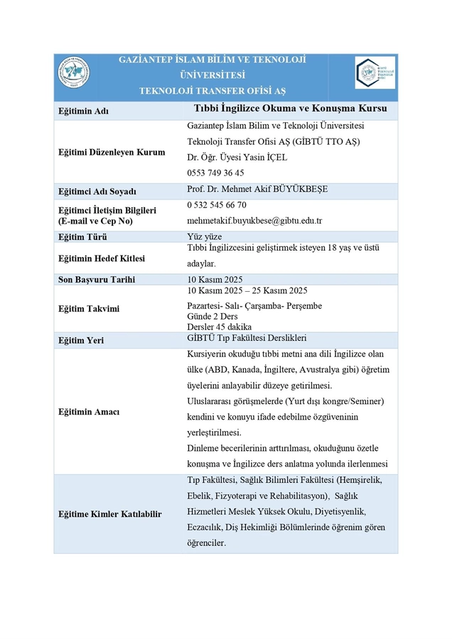 | Eğitim Yeri | GİBTÜ Tıp Fakültesi Derslikleri |