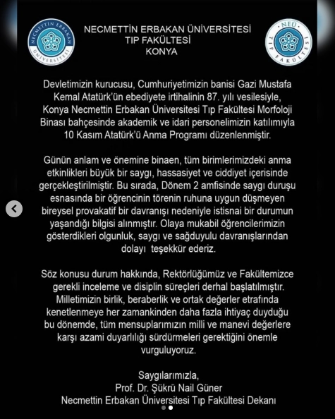 “Konya Necmettin Erbakan Üniversitesi Tıp Fakültesi’nde bir öğrenci, bu sabah Atatürk’ü anma töreninde saygı duruşu esnasında sahneye atladı, elini cebine sokarak telefonda konuşmaya başladı ve saygısızlığını ispata kalkıştı.