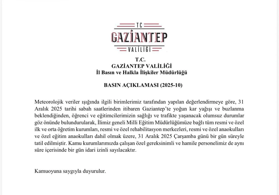 Gaziantep valiliğince yapılan açıklamaya göre 31 aralık çarşamba günü özel gereksinimli yani engelli ve hamile personeller idari izinlidir.