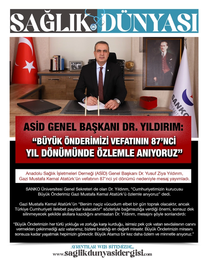 Anadolu Sağlık İşletmeleri Derneği (ASİD) Genel Başkanı Dr. Yusuf Ziya Yıldırım, Gazi Mustafa Kemal Atatürk’ün vefatının 87’nci yıl dönümü nedeniyle mesaj yayımladı.
