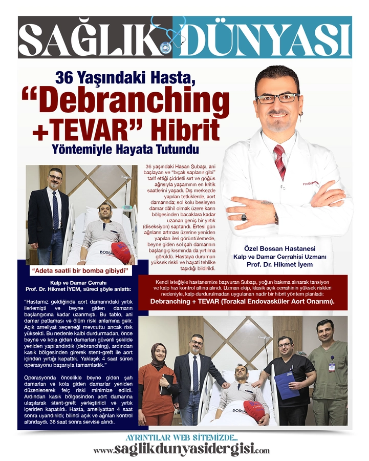 Kendi isteğiyle hastanemize başvuran Subaşı, yoğun bakıma alınarak tansiyon ve kalp hızı kontrol altına alındı. Uzman ekip, klasik açık cerrahinin yüksek riskleri nedeniyle, kalp durdurulmadan uygulanan nadir bir hibrit yöntem planladı: Debranching + TEVAR (Torakal Endovasküler Aort Onarımı).
