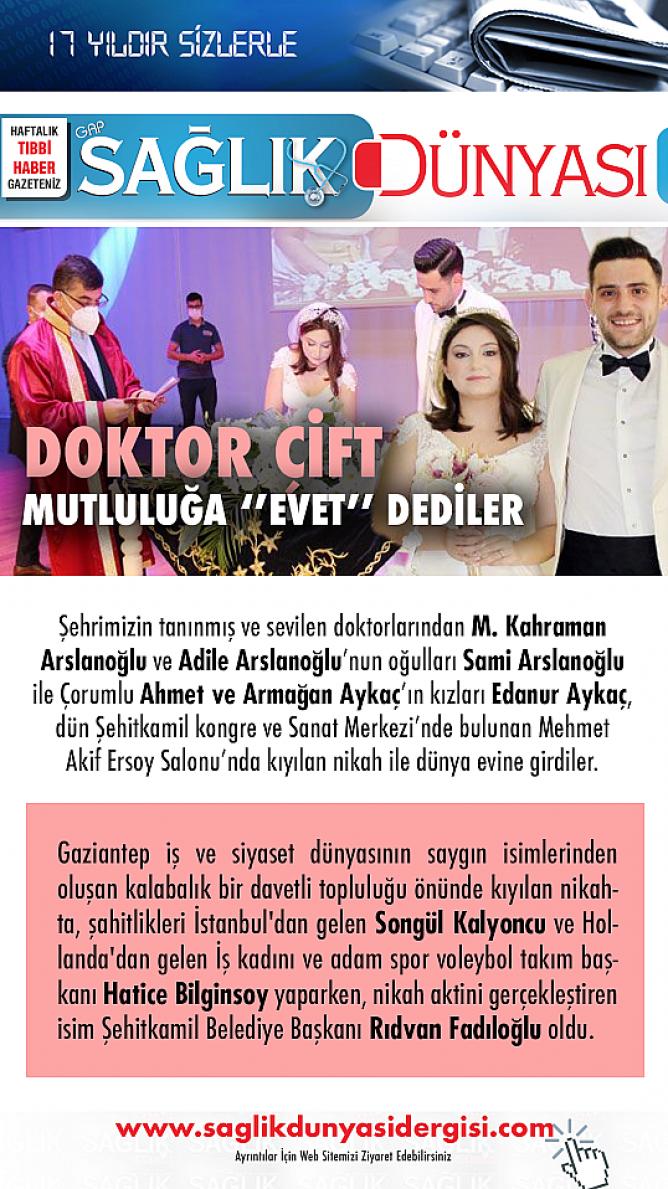 Şehrimizin tanınmış ve sevilen doktorlarından M. Kahraman Arslanoğlu ve Adile Arslanoğlu’nun oğulları Dr.Sami Arslanoğlu ile Çorum'un saygın ailelerinden Ahmet ve Armağan Aykaç’ın kızları Dr. Edanur Aykaç, dün Şehitkamil kongre ve Sanat Merkezi’nde bulunan Mehmet Akif Ersoy Salonu’nda kıyılan nikah ile dünya evine girdiler.