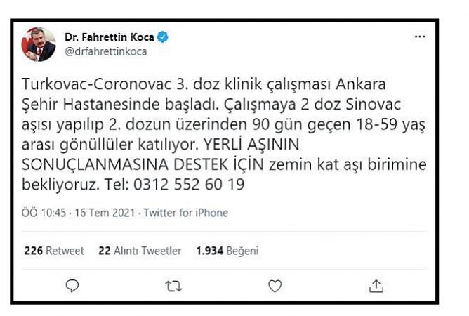 Bakan Koca açıklamasında telefon numarası da vererek “Turkovac-Coronovac 3. doz klinik çalışması Ankara Şehir Hastanesinde başladı. Çalışmaya 2 doz Sinovac aşısı yapılıp 2. dozun üzerinden 90 gün geçen 18-59 yaş arası gönüllüler katılıyor. Yerli aşının sonuçlanmasına destek için zemin kat aşı birimine bekliyoruz. Tel: 0312 552 60 19” ifadelerini kullandı.