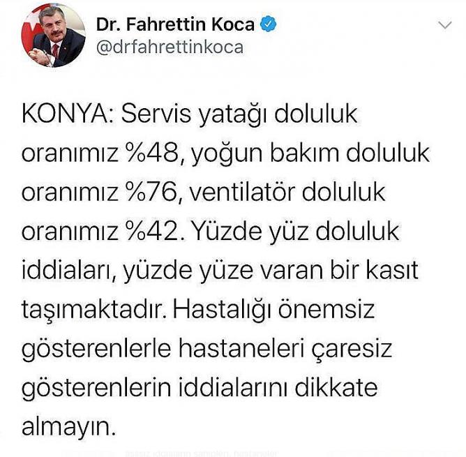 Bakan Koca, Twitter hesabından yaptığı paylaşımda, “Konya: Servis yatağı doluluk oranımız 48, yoğun bakım doluluk oranımız 76, ventilatör doluluk oranımız 42. Yüzde yüz doluluk iddiaları, yüzde yüze varan bir kasıt taşımaktadır. Hastalığı önemsiz gösterenlerle hastaneleri çaresiz gösterenlerin iddialarını dikkate almayın.” ifadelerini kullandı.