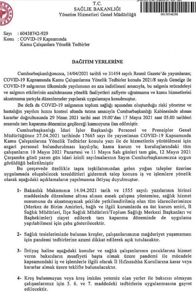 Sağlık Bakanlığı tarafından 81 ilin sağlık müdürlüğüne 'Covid-19 Kapsamında Kamu Çalışanlarına Yönelik Tedbirler' konulu genelge gönderildi. Koronavirüs salgınının toplum sağlığı açısından oluşturduğu riski yönetmek ve hastalığın yayılım hızını kontrol altında tutmak amacıyla Cumhurbaşkanlığı Kabinesi'nde alınan kararlar doğrultusunda bugün saat 19.00'dan başlanarak, 17 Mayıs günü saat 05.00'e kadar 'tam kapanma' kararı alındığı anımsatıldı. Cumhurbaşkanlığı İdari İşler Başkanlığı Personel ve Prensipler Genel Müdürlüğü'nce asgari personel bulundurulması kaydıyla kamu kurum ve kuruluşlarındaki tüm çalışanların 10 ve 11 Mayıs'ta tam gün, 12 Mayıs Çarşamba günü ise yarım gün idari izinli sayılmalarının uygun görüldüğü kaydedildi.