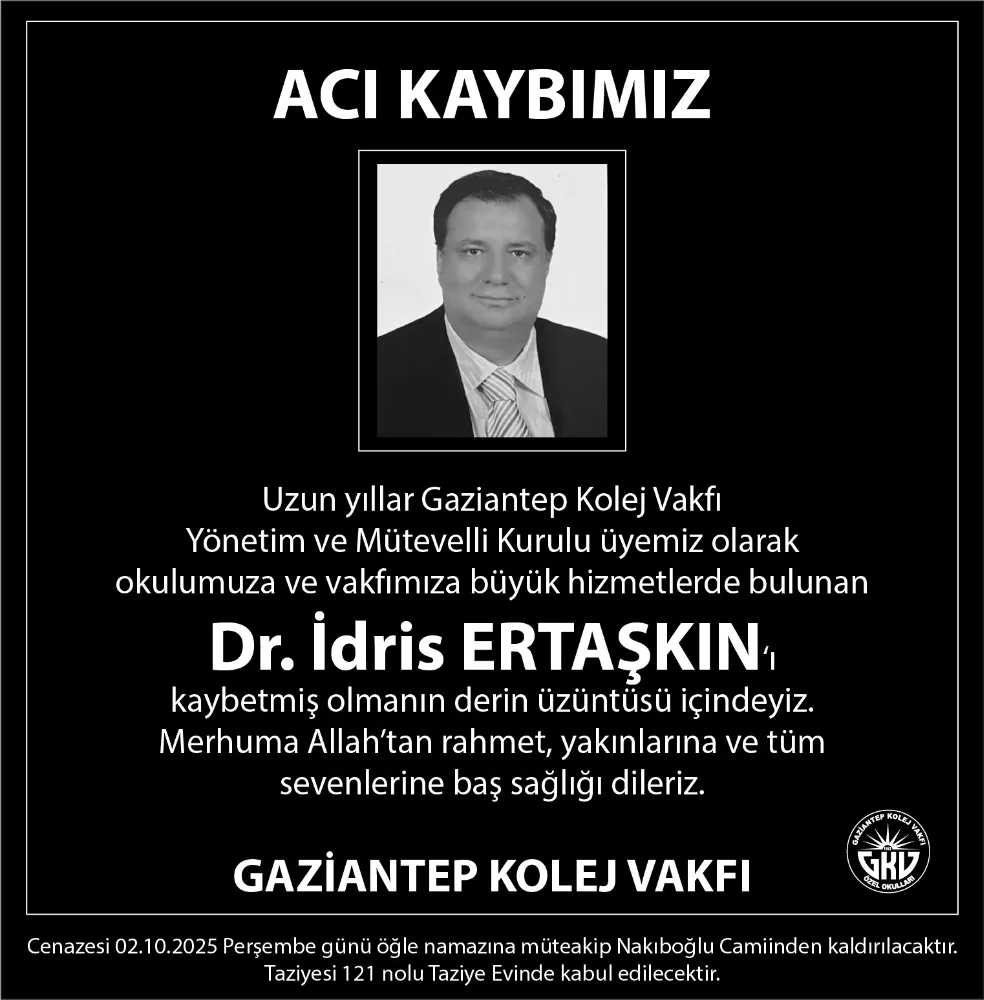 Uzun yıllar Gaziantep Kolej Vakfı Yönetim ve Mütevelli Kurulu üyemiz olarak okulumuza ve vakfımıza büyük hizmetlerde bulunan Dr. İdris ERTAŞKIN'ı kaybetmiş olmanın derin üzüntüsü içindeyiz. Merhuma Allah'tan rahmet, yakınlarına ve tüm sevenlerine baş sağlığı dileriz.