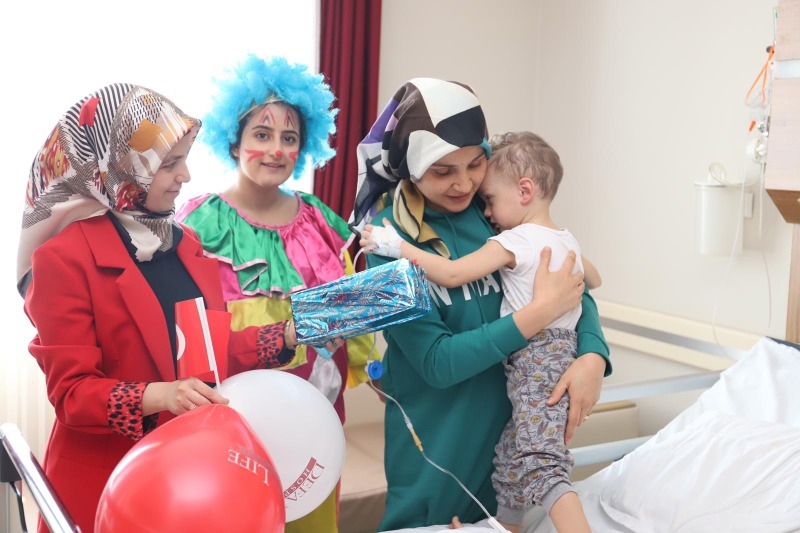 Muayene için gelen ve yatarak tedavi gören miniklere Palyaço kostümü giyen görevliler tarafından hediyeler verilerek, kollarında serumlar olmalarına rağmen mutlu bir gün geçirmeleri sağlandı.