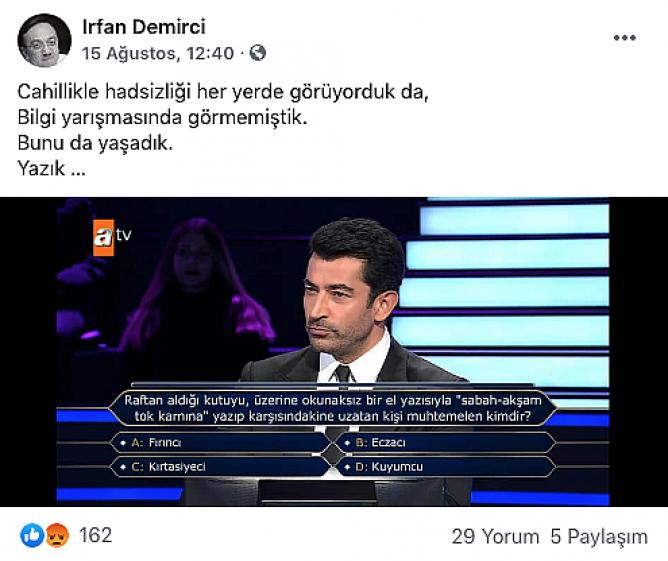 “Kim milyoner olmak ister ya da kim milyoner olmak için soruları cevaplamak ister bunu bilmiyoruz ama biz bu ‘dikkatsizlik‘ten sıkıldık” diyerek tepkisini şöyle sürdürdü: “Özür dilemeye davet etmiyoruz, çünkü dilediğiniz özrü pandemide halk sağlığı adına çalışırken hayatını kaybeden eczacılar duyamayacak.” (gazeteduvar.com.tr)