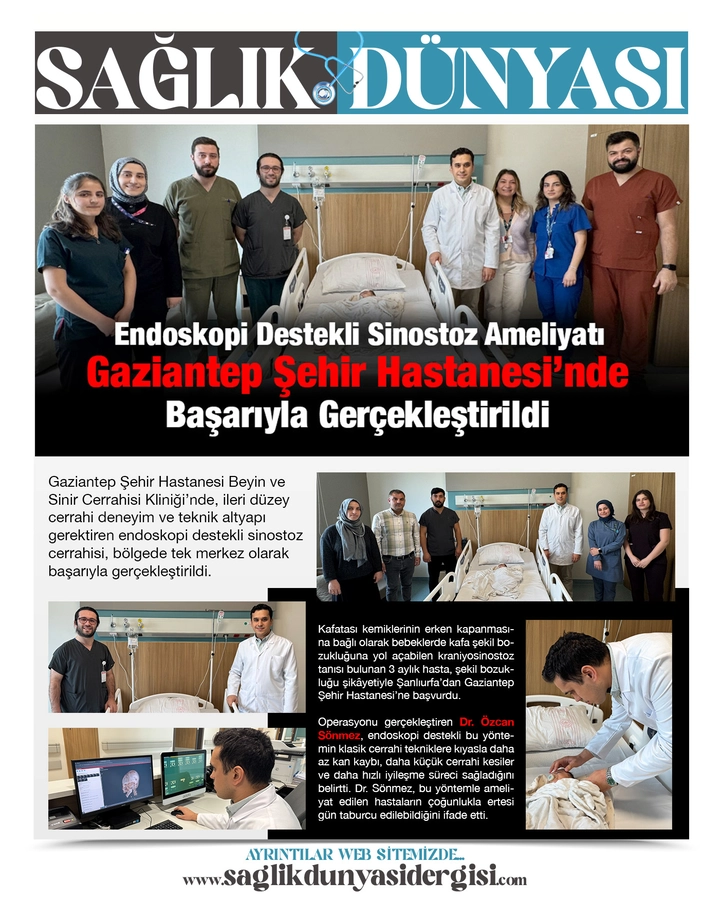 Gaziantep Şehir Hastanesi Beyin ve Sinir Cerrahisi Kliniği’nde, ileri düzey cerrahi deneyim ve teknik altyapı gerektiren endoskopi destekli sinostoz cerrahisi, bölgede tek merkez olarak başarıyla gerçekleştirildi.
