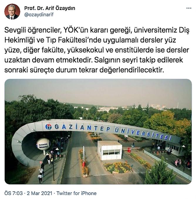 Gaziantep Üniversitesi Rektörü Prof. Dr. Arif Özaydın yüz yüze eğitim ile ilgili sosyal medya hesabından duyurdu.