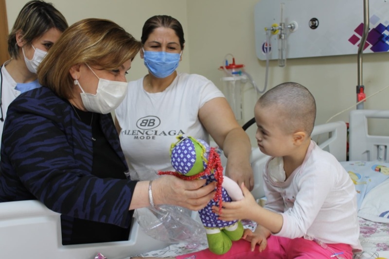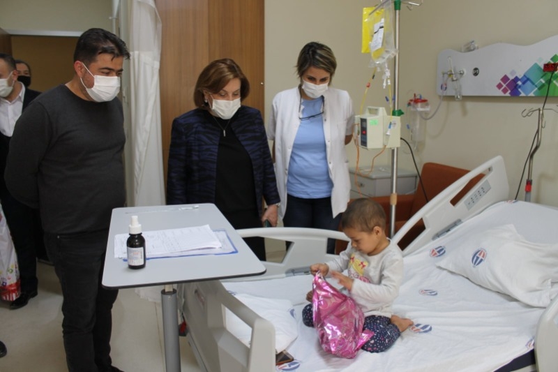Hastane Başhekimi Prof. Dr. Belgin Alaşehirli tedavi gören çocuklara hediyelerini iletirken, çocukların sağlık durumlarıyla ilgili bilgi alıp, ailelerine geçmiş olsun dileklerini sundu.