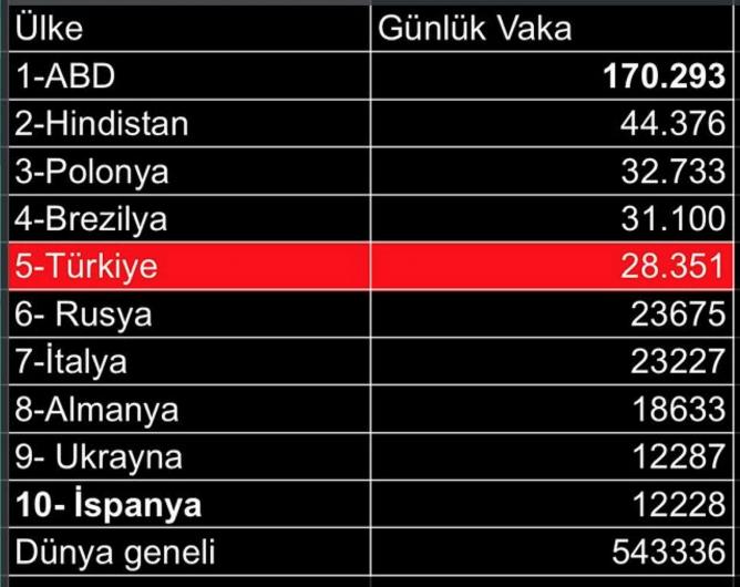 Yeni vaka sayısı ile birlikte Türkiye, 25 Kasım günlük vaka sayılarına göre dünyada 5’inci sırada yer aldı.(haberturk)