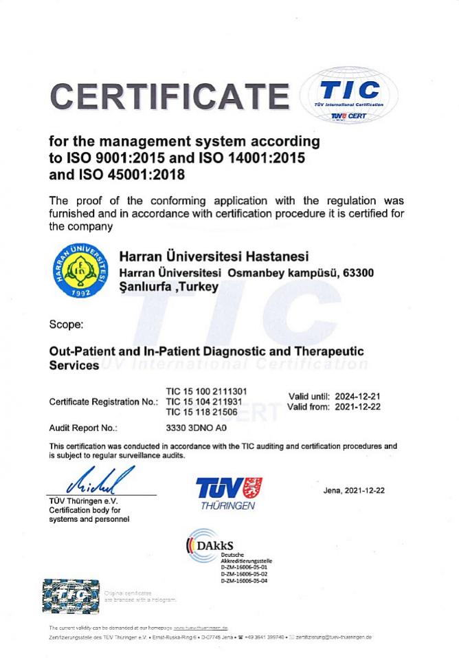 Şanlıurfa Harran Üniversitesi Hastanesi, TÜV International Certification firması tarafından gerçekleştirilen 4 aylık denetim ve değerlendirmeler sonucunda; ISO 9001 Kalite Yönetim Sistemi, ISO 14001 Çevre Yönetim Sistemi ve 45001 İş Sağlığı Güvenliği sertifikası almaya hak kazandı.