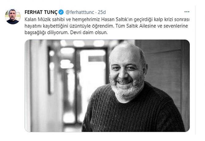 Kalp krizi nedeniyle Saltık’ın hayatını kaybettiğini belirten Tunç, “Kalan Müzik sahibi ve hemşehrimiz Hasan Saltık’ın geçirdiği kalp krizi sonrası hayatını kaybettiğini üzüntüyle öğrendim. Tüm Saltık Ailesine ve sevenlerine başsağlığı diliyorum. Devri daim olsun” dedi.